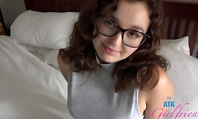 Pale ash-blonde nerd in glasses Rainie Mae rides a dick like a mad one for joy