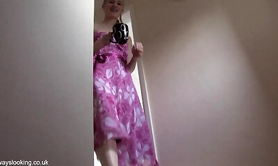 Tall light-haired in purple dress allows a down blouse flashes