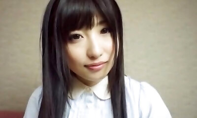 Shaved pussy of lovely Japanese college gal Ami Oya is poked doggy